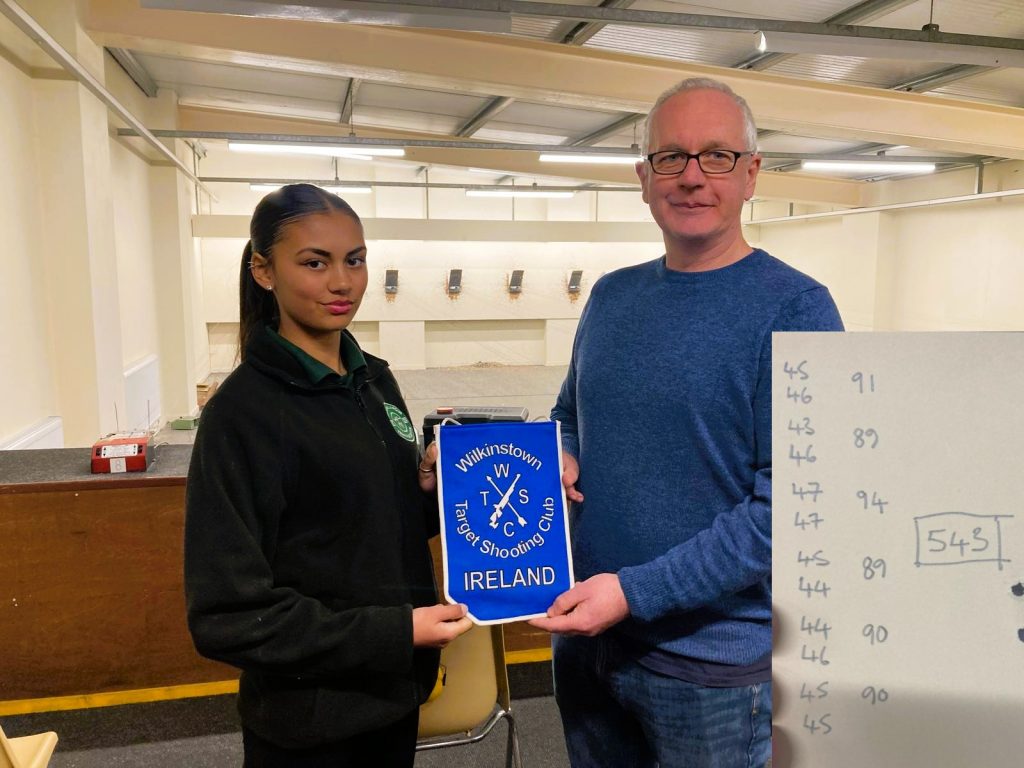 Ruby hits a new PB of 543 at the Ballyclare 10m Air Pistol match in Northern Ireland. Ruby becomes our first junior air pistol shooter to compete in NI. She is rightly delighted with her performance and to come home with a PB score adds to the history of this event.